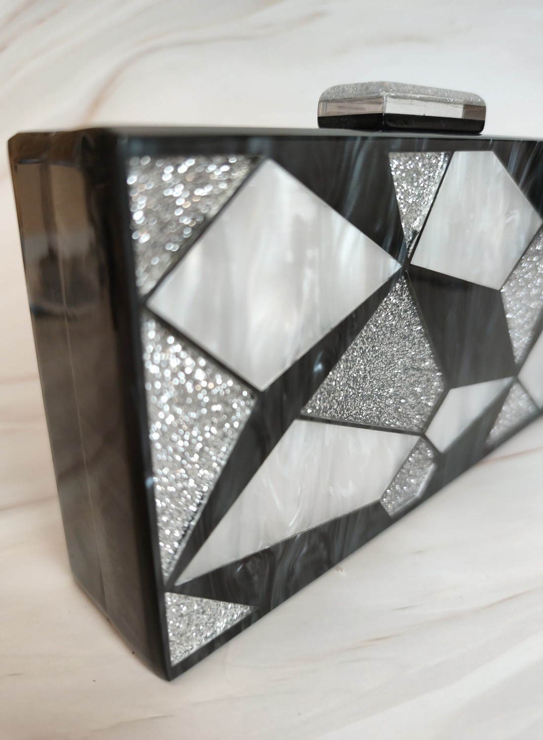 Bolso de fiesta en carey con una combinación de colores en blanco, gris efecto purpurina y gris oscuro ideal para combinar con cualquier look elegante. Posee una cadena larga que permite la opción de colgar del hombro.